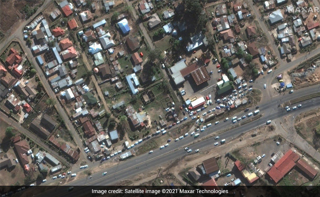 On today's imagery of Pietermaritzburg, long lines of people can be seen waiting to get food outside the few supermarkets that remain open and queue in their cars waiting to get gas.