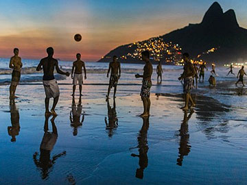 Men play football at Ipanema beach in Rio de Janeiro, Brazil on January 29, 2014.