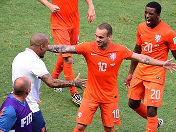 Netherlands' midfielder Wesley Sneijder (C) and Netherlands' midfielder Georginio Wijnaldum (R) celebrate their victory at the end of a Round of 16 football match between Netherlands and Mexico at Castelao Stadium in Fortaleza during the 2014 FIFA World C