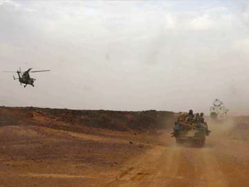 A picture taken on May 17, 2014 shows an helicopter of the French army escorting a vehicule transporting Mali's Prime Minister Moussa Mara from Gao to Kidal. Eight soldiers and 28 insurgents were killed in fighting on May 17 outside the regional governor'