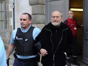 Maurice Agnelet (R) leaves flanked by French gendarmes after hearing the verdict of his third trial on April 11, 2014 at the Rennes courthouse, western France