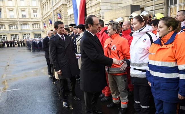 (From R) French President Francois Hollande and Prime minister Manuel Valls shake hands with emergency medical staff at the police headquarters, in Paris today. (AFP Photo)