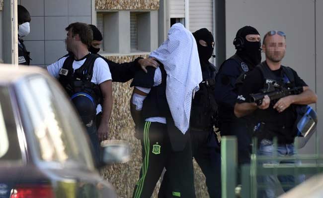 French police escort Yassin Salhi (C), a man suspected of decapitating his boss in an attack on a gas factory, as they leave his flat in Saint-Priest on June 28, 2015. (AFP)