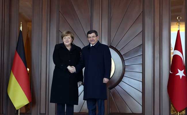 German Chancellor Angela Merkel, left, and Turkish Prime Minister Ahmet Davutoglu shake hands during a welcoming ceremony in Ankara
