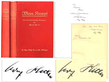 This undated image provided by Nate D. Sanders Auction shows the Adolph Hitler inscribed "Mein Kampf" volume to future SS leader Joseph Bauer.