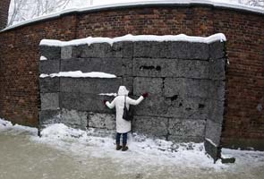 A Japanese visitor touches the death wall at the Auschwitz concentration camp