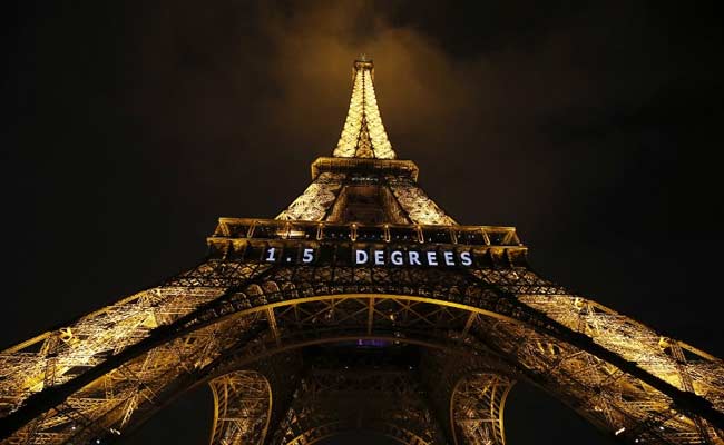 "1.5 Degrees" in white neon is lit on the Eiffel Tower in the French capital, as the COP21 United Nations Climate Change Conference takes place at Le Bourget, on the outskirts of Paris, on December 11, 2015. (AFP)