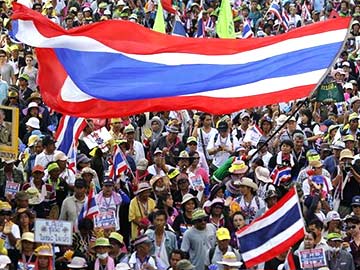 Anti-government protesters wave flags as they follow their leader Suthep Thaugsuban marching in downtown Bangkok on March 27, 2014