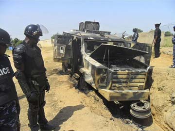 In this photo, police look down on a burnt out army personal carrier following an attack by Boko Haram in in Damaturu, Nigeria.