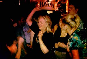 Still attired in the smart black evening pant suit set off by an impressive sparkly necklace that she wore to the dinner, Clinton was seen enjoying herself at a late-night gathering of her staff in the Cafe Havana.