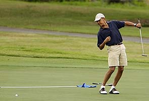 In this file pohto, President Barack Obama watches the ball after making a putt on the ninth green during his golf match at Mid-Pacific County Club in Kailua, Hawaii. Credit: The Associated Press.