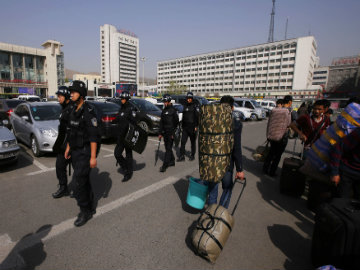 Armed policemen walk past passengers near the entrance of the South Railway Station, where three people were killed and 79 wounded in Wednesday's bomb and knife attack, in Urumqi, Xinjiang Uighur Autonomous region