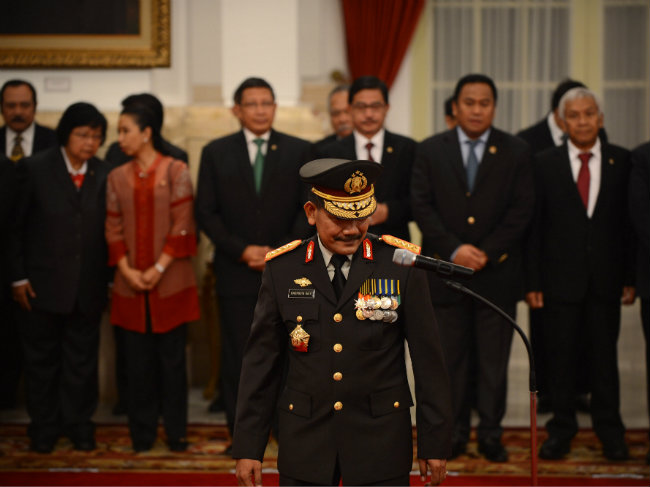 Indonesian Police General Badrodin Haiti (C) takes his spot for the official swearing-in as Indonesia's new national police chief. (AFP Photo)
