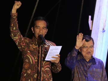 Indonesian presidential candidate Joko Widodo (L) gestures as delivers a speech, beside his running mate Jusuf Kalla, on a phinisi boat, a traditional Indonesian ship, at Sunda Kelapa port after he was declared the winner of the presidential elect