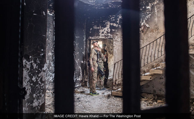 A SWAT soldier looks at the building where they found an Islamic State prison in Fallujah. The downstairs rooms were used as group cells, and the upstairs for solitary confinement. (Photo for The Washington Post by Hawre Khalid)