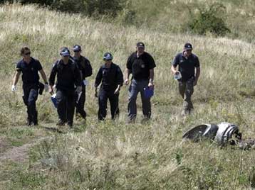 Australian experts examine the area of the Malaysia Airlines Flight 17 plane crash in the village of Hrabove, Donetsk region, eastern Ukraine Friday, Aug. 1, 2014.