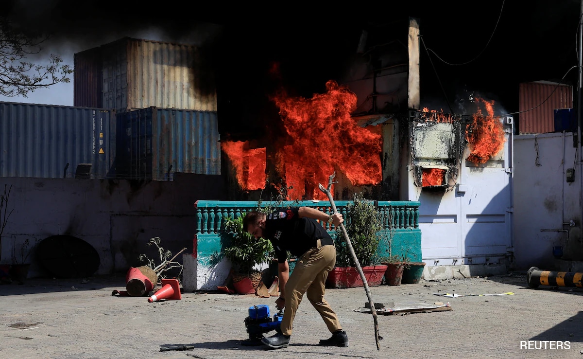 Smoke rises as protesters engage in a clash with security forces outside the US Consulate General in Karachi