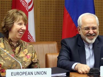 European foreign policy chief Catherine Ashton, left, and Iranian Foreign Minister Mohamad Javad Zarif, right, wait for the start of closed-door nuclear talks in Vienna, Austria, Wednesday, May 14, 2014
