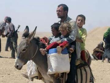 Displaced people from the minority Yazidi sect, fleeing violence from forces loyal to the Islamic State in Sinjar town, ride a donkey as they make their way towards the Syrian border, on the outskirts of Sinjar mountain.