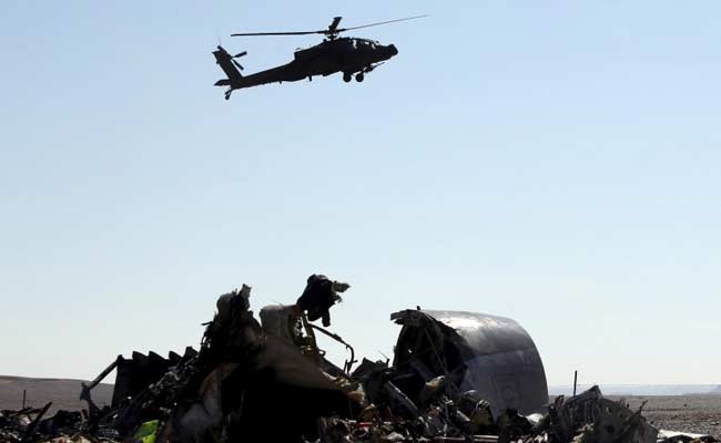 An Egyptian military helicopter flies over debris from a Russian airliner which crashed at the Hassana area in Arish city, north Egypt, November 1, 2015. (Reuters)