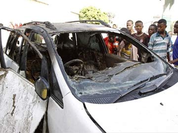 Somalis look at the smashed car in which a Somali journalist was killed by a bomb planted under his car in the Somali capital of Mogadishu, Saturday, June, 21 , 2014.
