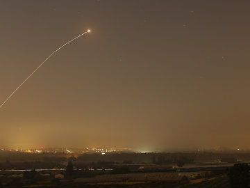 An interception by the Iron Dome anti-missile system is seen as rockets are launched from Gaza towards Israel before a 72-hour ceasefire was due to expire August 13, 2014.