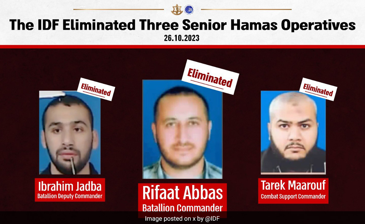 The Israel Defence Forces (IDF) on Friday said its fighter jets struck three senior Hamas operatives in the Daraj Tuffah Battalion. The IDF said the battalion's operatives played a significant part in Hamas's attack on Israel.