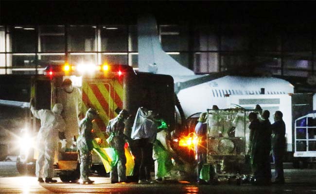 Medical staff in protective clothing transport a healthcare worker diagnosed with the Ebola virus disease in a quarantine tent at Glasgow airport, Scotland. (Associated Press)