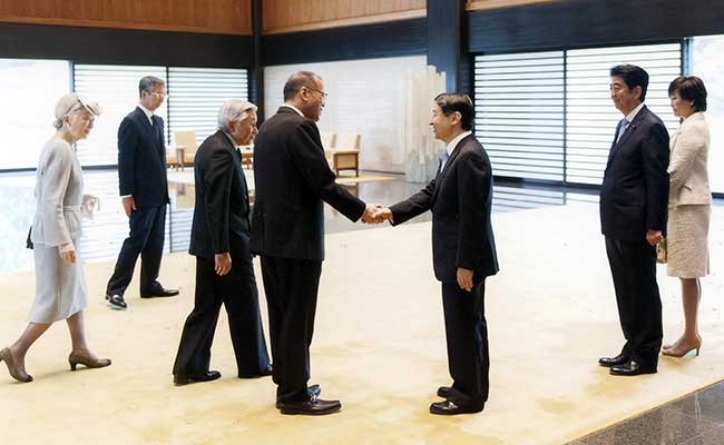 Philippine President Benigno Aquino shaking hands with Japan's Crown Prince Naruhito, watched by Japanese Prime Minister Shinzo Abe at the Imperial at the Imperial Palace in Tokyo on June 3, 2015. (AFP PHOTO / Imperial Household Agency)