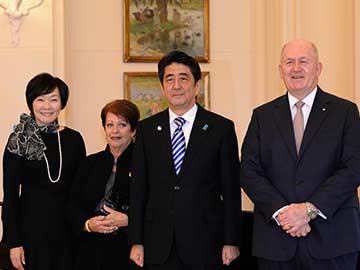 Australia's Governor-General (R) Peter Cosgrove and his wife Lynne Cosgrove (2nd L) pose for picture with the visiting Japanese Prime Minister Shinzo Abe (C) and his wife Akie prior to their meeting in Canberra on July 8, 2014.