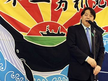 Japan's Agriculture, Forestry and Fisheries Minister Yoshimasa Hayashi speaks during the 26th whale meat tasting event in Tokyo.