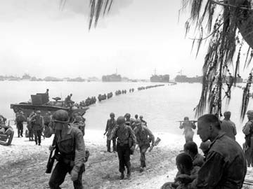 FILE - This July 1944 file photo shows US Army reinforcement troops making an amphibious landing on the coral reef at Saipan beach, Mariana Islands.