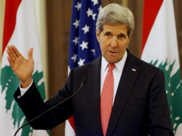 US Secretary of State John Kerry speaks during a press conference after his meeting with Lebanese Prime Minister Tamam Salam, at the government palace, in Beirut, Lebanon, Wednesday June 4, 2014.