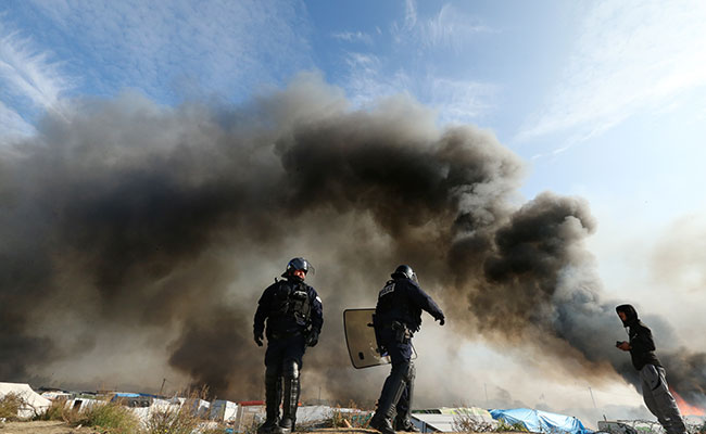 Huge clouds of black smoke billowed over the sprawling settlement near the port city of Calais, which the French authorities said they expect to finish clearing by the evening.