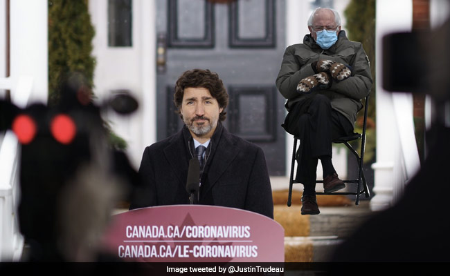 On Saturday, Trudeau posted a photo of himself giving a press conference from his lawn on Twitter, with the now famous image of a seated, mitten-clad Sanders superimposed in the background.