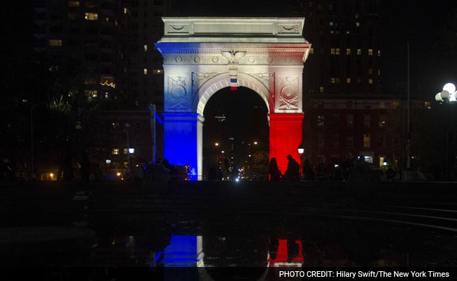 The Washington Square Arch is lit in the colors of the French flag during a vigil for Paris at Washington Square Park in New York, Nov. 14, 2015.