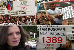 One large placard read "Yes to Kosovo Democratic Republic, No to Kosovo Anti-Islamic Dictatorship."
