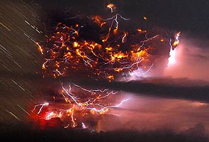 Flights in the region were canceled and more than 3,500 people stayed away from their homes near the volcano, which produced an eerie show of lightning dancing through its clouds of ash overnight.