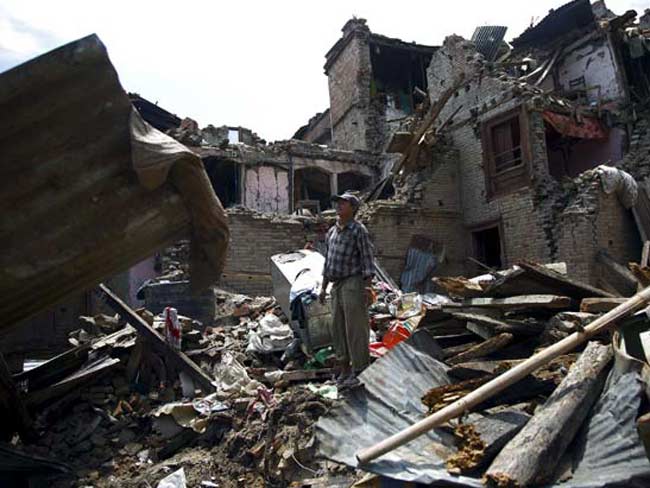 A man stands on the debris of collapsed houses after a fresh 7.3-magnitude earthquake struck Nepal, in Sankhu May 12, 2015. REUTERS/Navesh Chitrakar