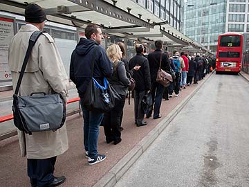 Commuters queue for buses outside Victoria station in London, on April 29, 2014, as a planned 48 hour underground train strike came into effect late Monday night.