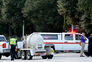 Police block the road to the Jacksonville International Airport terminal as the bomb disposal unit drives by on the right