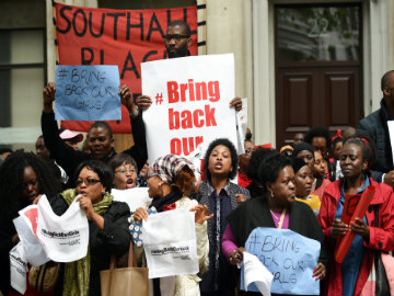 Protestors hold placards and chant slogans to appeal to the Nigerian government to act against the Boko Haram Islamist Group