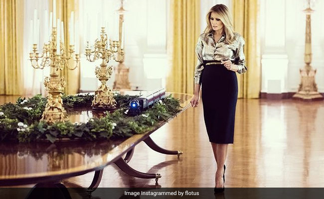 The first lady always looks runway ready in her annual White House Christmas videos that she shares on Twitter on the day the decorations are unveiled. Today's installment, marking the Trumps' fourth and last Christmas in the White House - at least in this go round - highlights her 2020 "America the Beautiful" theme. Dressed in a shimmery gold top and stiletto heels, she glides, softly smiling, through the glittering, twinkling rooms in the one-minute tour of the decorations, which this year include American flag ornaments and photos of historic American female leaders.
