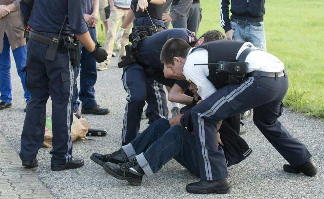 Austrian policemen arrest a suspect at the train station Sulz-Rothis in Vorarlberg, Austria. (AFP)