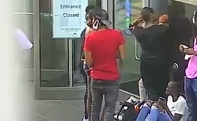 The video shows a Black man shooting himself at the entrance of a building as a nearby group of people ran away and police approach the scene.