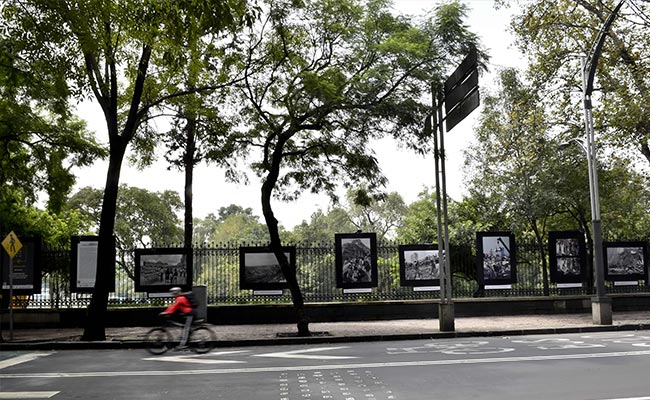 A cyclist rides in front of pictures showing damages caused by the 1985 earthquake, exposed at a fence of Chapultepec forest along Reforma avenue in September 17, 2015 in Mexico City.(AFP)