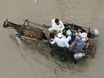 A Pakistani family travels on a horse-cart through flood road following heavy rain in Lahore (Reuters)