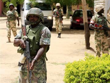 In this Thursday, June 6, 2013 file photo Nigerian soldiers stand guard at the offices of the state-run Nigerian Television Authority in Maiduguri, Nigeria
