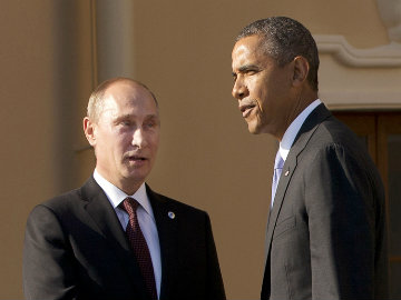File photo: President Barack Obama shakes hands with Russian President Vladimir Putin during arrivals for the G-20 summit at the Konstantin Palace in St. Petersburg, Russia
