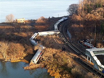 The Metropolitan Transportation Authority says four or five cars on the seven-car train derailed about 100 yards (90 metres) north of the station on a curved section of the track. But the MTA says none of the cars entered the Hudson or Harlem rivers, which are adjacent.